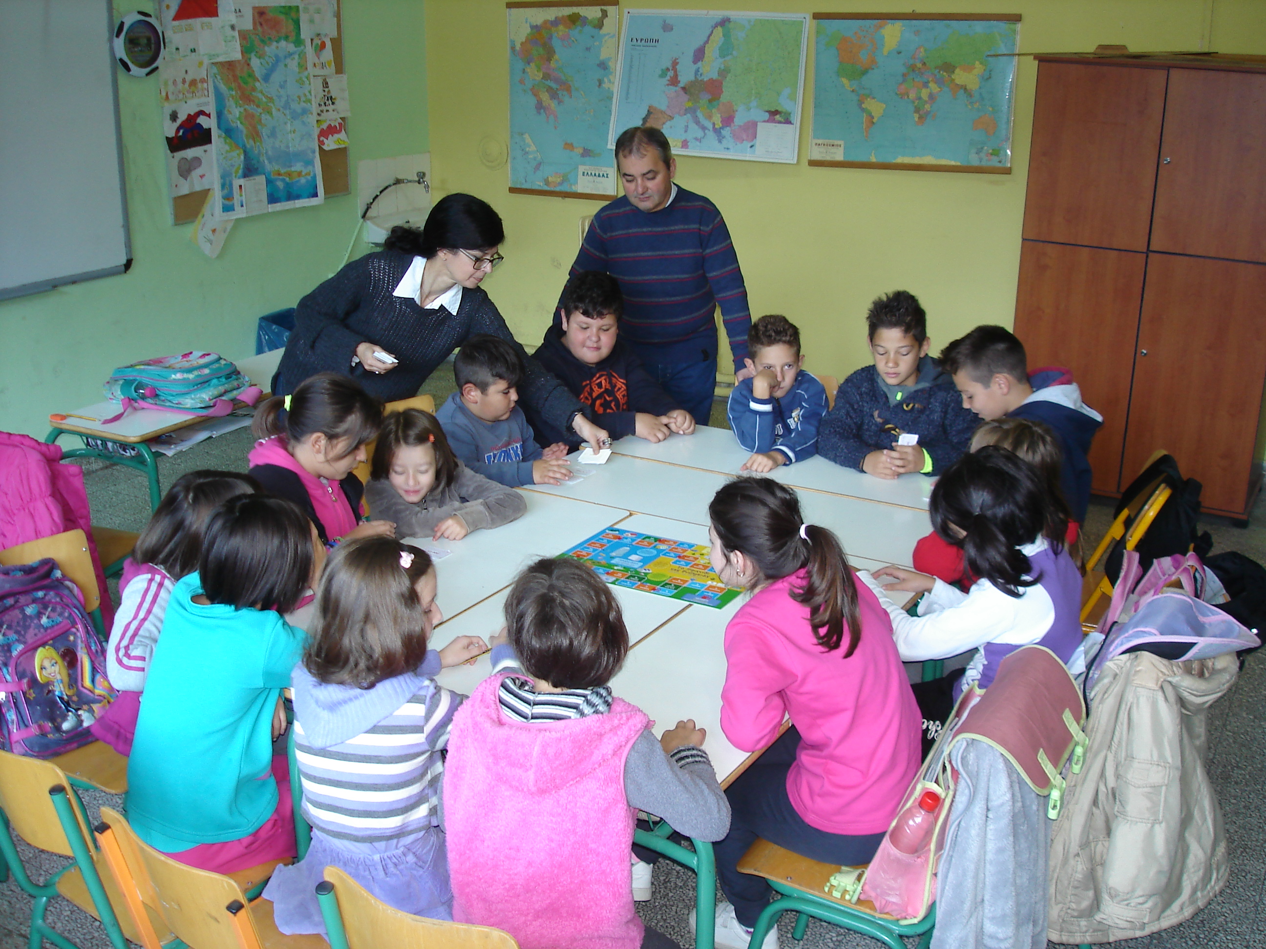 Στη συνέχεια, μπήκαμε στην αίθουσα – ψηλοτάβανη και ηλιόλουστη με τεράστια παράθυρα – όπου είχαν συγκεντρωθεί όλα τα παιδιά. Ο κύριος Γιάννης με σύστησε και όλοι μαζί διαμορφώσαμε την αίθουσα μετακινώντας θρανία και καρέκλες, έτσι ώστε να έχουμε μια μεγάλη επίπεδη επιφάνεια, πάνω στην οποία στήσαμε το επιτραπέζιο παιχνίδι. Τα παιδιά χωρίστηκαν σε ομάδες, έτσι ώστε κάθε ομάδα να έχει μαθητές μικρών και μεγάλων τάξεων, και κάθησαν γύρω από το τραπέζι που δημιουργήσαμε. Η ώρα κύλησε δίχως να το καταλάβω, παίζοντας, γελώντας, συζητώντας. Όταν τελειώσαμε, βγάλαμε μια αναμνηστική φωτογραφία όλοι μαζί. Με τα δικά μου μάτια είδα τα παιδιά χαρούμενα και τους δυο δασκάλους ικανοποιημένους, που με τη συμμετοχή τους στο πρόγραμμα, πρόσφεραν στους μαθητές τους μια ευχάριστη, ουσιαστική και ταυτόχρονα διαφορετική εμπειρία από ότι συνήθως. Φεύγοντας, πήρα οδηγίες για το πώς θα έβρισκα το Γυμνάσιο – πέντε λεπτά με τα πόδια από το Δημοτικό.