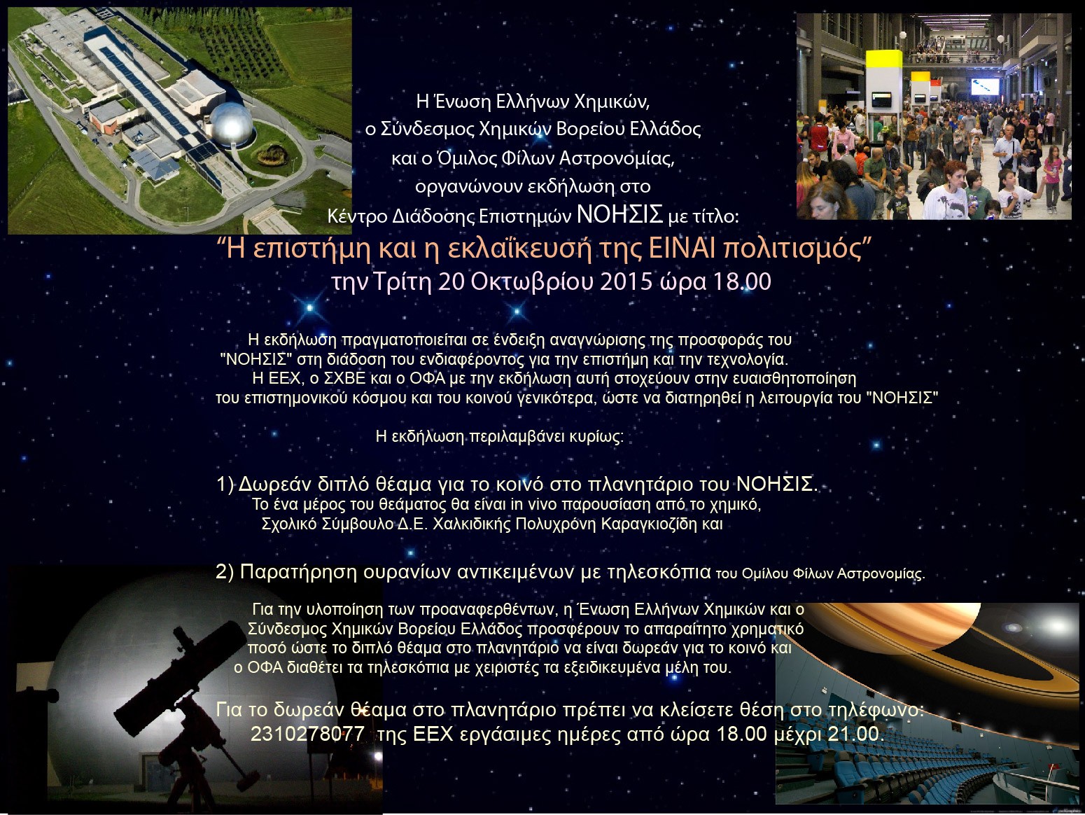 Η Ένωση Ελλήνων Χημικών, ο Σύνδεσμος Χημικών Βορείου Ελλάδος και ο Όμιλος Φίλων Αστρονομίας, οργανώνουν εκδήλωση στο ΝΟΗΣΙΣ με τίτλο: