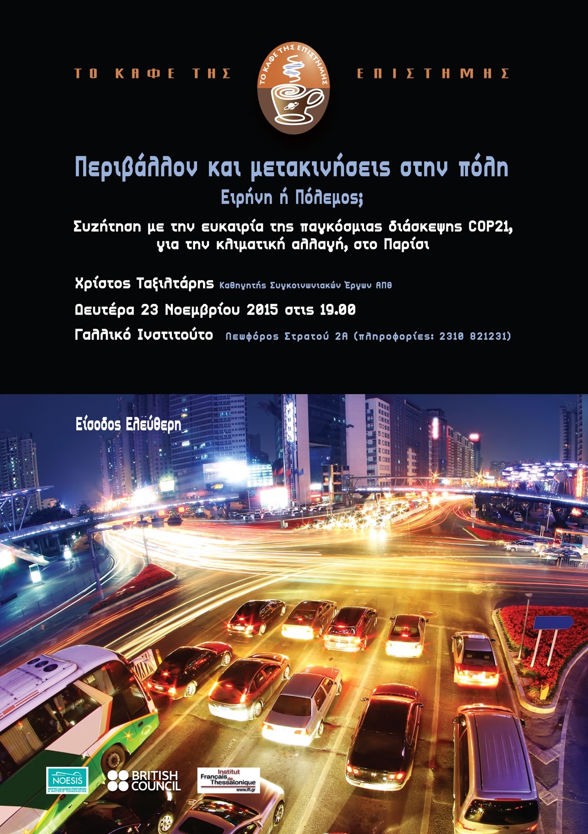 Με τη συνεργασία του Γαλλικού Ινστιτούτου Θεσσαλονίκης, του Βρετανικού Συμβουλίου και του ΝΟΗΣΙΣ συνεχίζεται για ενδέκατη συνεχή χρονιά η πραγματοποίηση των «Καφέ της Επιστήμης» και όπως πάντα, σας προσκαλούν να απολαύστε τον καφέ σας και να συζητήσετε με τους ειδικούς επιστημονικά ζητήματα που προκαλούν το ενδιαφέρον.