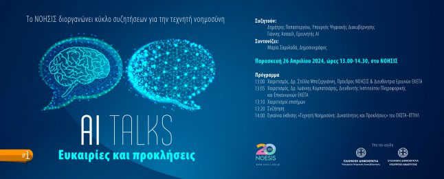 Με αφορμή την επέτειο των 20 χρόνων λειτουργίας του, το ΝΟΗΣΙΣ μεταξύ άλλων δράσεων, διοργανώνει μία σειρά ανοιχτών συζητήσεων με τίτλο “AI-Talks” με θέμα την τεχνητή νοημοσύνη, τις ευκαιρίες και τις προκλήσεις που αναδύονται μέσα από την ταχύτατη ανάπτυξη και την σχεδόν καθολική διείσδυσή της σε όλες τις πτυχές της ανθρώπινης δραστηριότητας, όπως στην ιατρική, στη νομική, στην πληροφορική, στην εκπαίδευση, στον πολιτισμό, στη δημοσιογραφία, αλλά και στη βιομηχανία, οι οποίες τελούν υπό την αιγίδα του Υπουργείου Ψηφιακής Διακυβέρνησης.