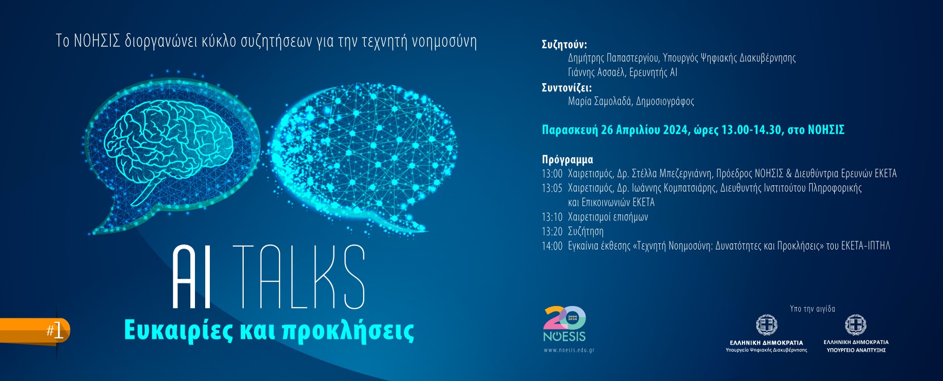 Η πρώτη συζήτηση “AI- Talks: Ευκαιρίες και προκλήσεις”, θα πραγματοποιηθεί την Παρασκευή 26 Απριλίου 2024, στις 13:00-14:00, στο ΝΟΗΣΙΣ, μεταξύ του Υπουργού Ψηφιακής Διακυβέρνησης, Δημήτρη Παπαστεργίου και του διακεκριμένου επιστήμονα, Γιάννη Ασσαέλ, θέτοντας ερωτήματα όπως τι είναι η Τεχνητή Νοημοσύνη και το Generative AI, ποια είναι τα πρώτα βήματα για την εκμάθηση της, σε ποιο σημείο βρίσκεται σήμερα η Ελλάδα, ποιος είναι ο σχεδιασμός για τα επόμενα χρόνια και σε ποιους τομείς μπορεί η χώρα να καινοτομήσει, ποια είναι η σημασία της διεπιστημονικής έρευνας, πώς μπορούμε να είμαστε προετοιμασμένοι για το μέλλον, αλλά και πώς μπορούμε να προστατευτούμε. Τη συζήτηση συντονίζει η δημοσιογράφος, Μαρία Σαμολαδά.
