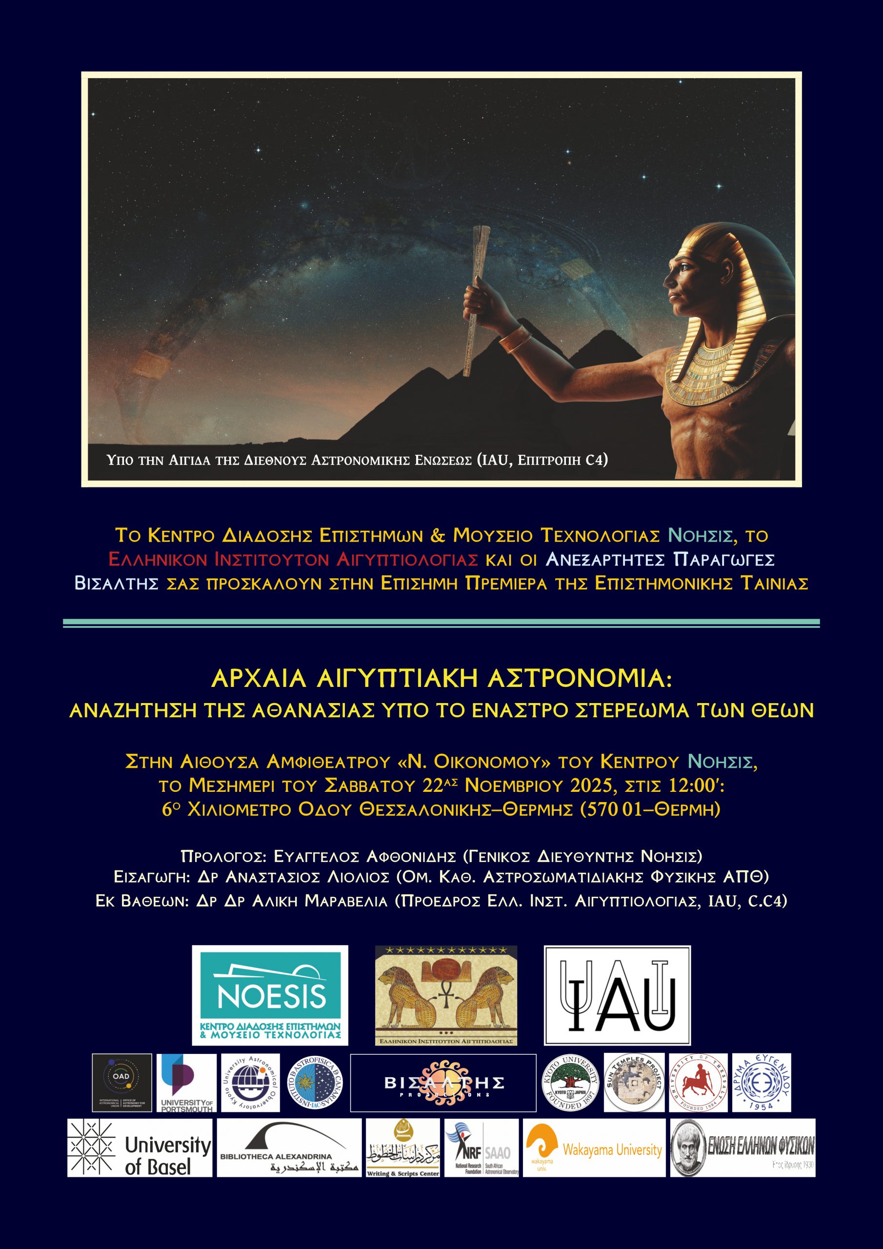 Το ΝΟΗΣΙΣ και το Ελληνικό Ινστιτούτο Αιγυπτιολογίας παρουσιάζουν την πρεμιέρα της ταινίας «Αρχαία Αιγυπτιακή Αστρονομία: Αναζήτηση της Αθανασίας υπό το Έναστρο Στερέωμα των Θεών», που θα πραγματοποιηθεί το Σάββατο 22 Νοεμβρίου 2025, στις 12:00 το μεσημέρι, στο Αμφιθέατρο του ΝΟΗΣΙΣ.