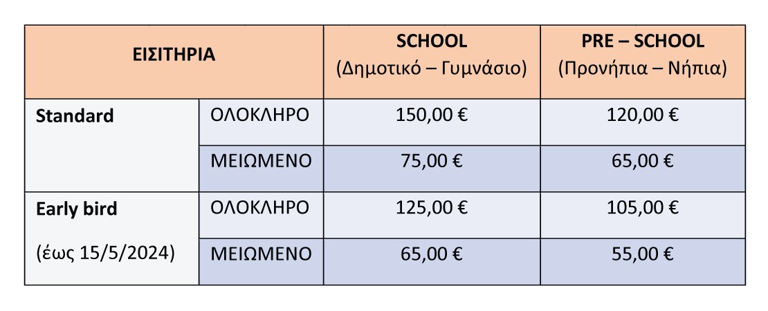 Ισχύουν ειδικές μειωμένες τιμές early birds για κρατήσεις μέχρι και τις 15/5 και μειωμένες τιμές για αδερφάκια και πολύτεκνες οικογένειες. Μειωμένη τιμή δικαιούνται οι πολύτεκνες οικογένειες (από την 1η συμμετοχή στο πρόγραμμα, απαραίτητη η επίδειξη πολυτεκνικού πάσο την πρώτη ημέρα του προγράμματος) και οικογένειες που εγγράφουν αδερφάκια (το 1ο παιδί πληρώνει κανονικά, η έκπτωση εφαρμόζεται από το 2ο παιδί και μετά).