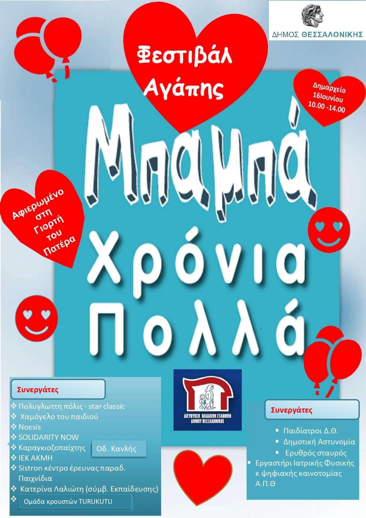Ο Δήμος Θεσσαλονίκης, την Κυριακή 16 Ιουνίου 2024, από τις 10.00 μέχρι τις 14.00, διοργανώνει το 1ο Φεστιβάλ Αγάπης, στον χώρο του Δημαρχείου.