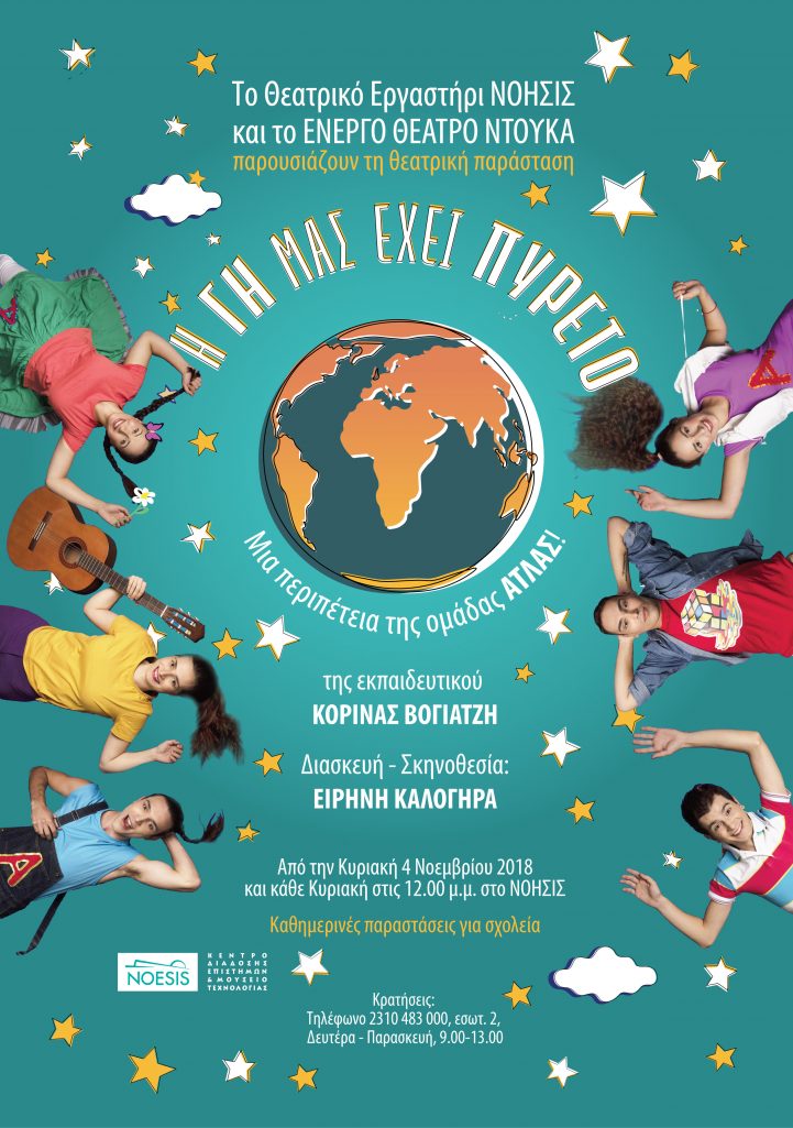 Το Θεατρικό Εργαστήρι ΝΟΗΣΙΣ και το ΕΝΕΡΓΟ ΘΕΑΤΡΟ ΝΤΟΥΚΑ παρουσιάζουν την παιδαγωγική, οικολογική, περιβαλλοντική παράσταση «Η ΓΗ ΜΑΣ ΕΧΕΙ ΠΥΡΕΤΟ! …μια ακόμα περιπέτεια της ομάδας ΑΤΛΑΣ» σε σκηνοθεσία Ειρήνης Καλογηρά, βασισμένη στο ομότιτλο βιβλίο της εκπαιδευτικού Κορίνας Βογιατζή.