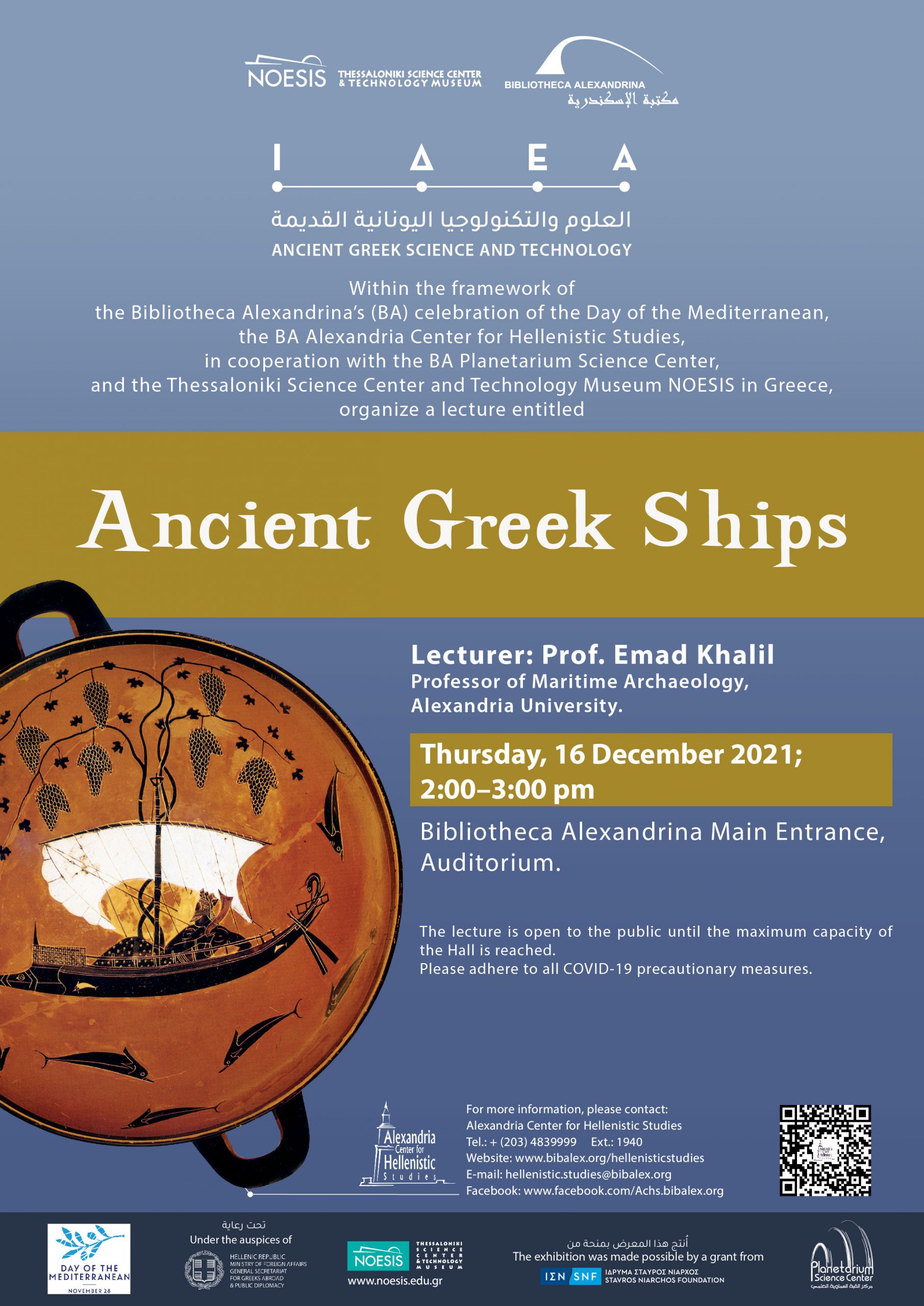 Στο πλαίσιο της παρουσίας της έκθεσης ΙΔΕΑ στη Βιβλιοθήκη της Αλεξάνδρειας της Αιγύπτου, το Planetarium Science Center της Βιβλιοθήκης, σε συνεργασία με το Alexandria Center for Hellenistic Studies, διοργανώνει την Πέμπτη 16 Δεκεμβρίου 2021, ώρες 14.00-16.00, ομιλία με θέμα: “Ancient Greek Ships” και ομιλητή τον Prof. Emad Khalil, Professor of Maritime Archaeology, του Πανεπιστημίου της Αλεξάνδρειας.