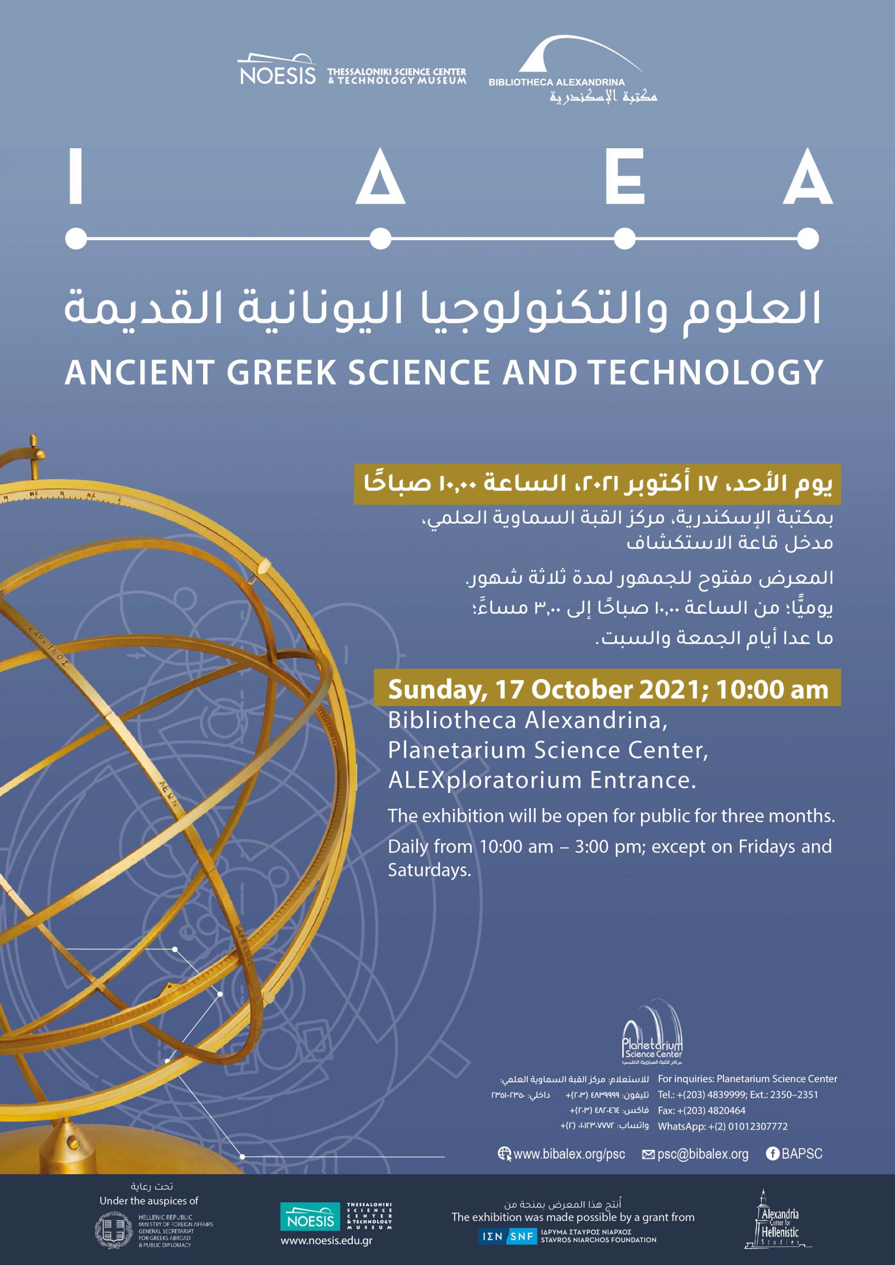 Η έκθεση ΙΔΕΑ-Αρχαία Ελληνική Επιστήμη και Τεχνολογία πρόκειται να παρουσιαστεί στον εμβληματικό χώρο της νέας Βιβλιοθήκης της Αλεξάνδρειας της Αιγύπτου (www.bibalex.org), από τις αρχές Οκτωβρίου 2021 μέχρι τις αρχές Ιανουαρίου 2022. Η έναρξη λειτουργίας της προγραμματίζεται για τις 17 Οκτωβρίου 2021 και τα εγκαίνιά της για τις 9 Νοεμβρίου 2021.