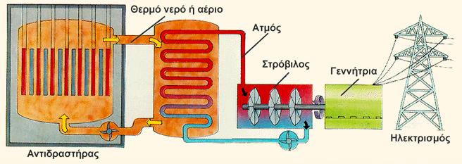 Ειδικές ράβδοι βορίου στο εσωτερικό του αντιδραστήρα, περιορίζουν τη διάσπαση νέων πυρήνων. Το στοιχείο που χρησιμοποιείται ως καύσιμο στους πυρηνικούς αντιδραστήρες είναι το ουράνιο 235. Κατά τη διάρκεια της αντίδρασης, το ουράνιο υπερθερμαίνεται. Το ψυκτικό μέσο (υγρό ή αέριο) που κυκλοφορεί στον αντιδραστήρα, απορροφά την παρα-γόμενη θερμότητα και θερμαίνει το νερό ενός λέβητα. Ο ατμός που παράγεται κινεί τους στροβίλους και μέσω αυτών και τις γεν-νήτριες παραγωγής ηλεκτρικού ρεύματος.