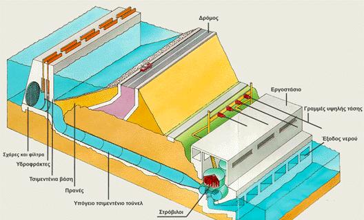 Σχηματικό διάγραμμα λειτουργίας ενός υδροηλεκτρικού σταθμού.