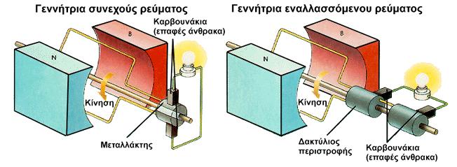 Αν η γεννήτρια δεν έχει μεταλλάκτη, μας δίνει ρεύμα του οποίου η φορά συνεχώς αλλάζει, δηλαδή εναλλασσόμενο ρεύμα (A.C.). Μάλιστα το πόσο γρήγορα αντιστρέφεται η φορά του ρεύματος, καθορίζεται από την ταχύτητα περιστροφής του αγωγού. Τέτοιες γεννήτριες λέγονται “ενναλλάκτες”.