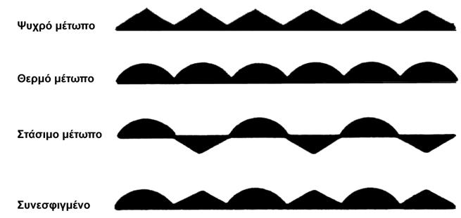 Αν σε ένα κινούμενο μέτωπο προηγείται θερμή αέρια μάζα της ψυχρής, αυτό ονομάζεται “ψυχρό” ενώ όταν συμβαίνει το αντίθετο λέγεται “θερμό”.