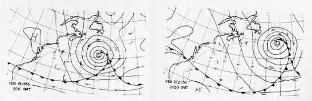 Στο χάρτη φαίνονται δύο στάδια από την ανάπτυξη και κίνηση μιας ισχυρής ύφεσης τη χειμερινή περίοδο στο Βόρειο Ατλαντικό.
