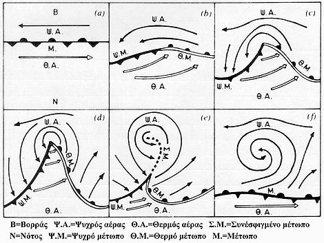 Διάφορα στάδια δημιουργίας και εξέλιξης μιας μετωπικής ύφεσης.