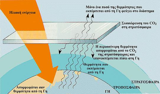 Η Γη μας, καθώς θερμαίνεται από τον Ήλιο, εκπέμπει υπέρυθρη ακτινοβολία. Φαινόμενο του θερμοκηπίου ονομάζεται η απορρόφηση αυτής της ακτινοβολίας από την ατμόσφαιρα, με αποτέλεσμα η θερμοκρασία της ατμόσφαιρας να αυξάνεται. Κανονικά τμήμα αυτής της ακτινοβολίας θα έφευγε στο διάστημα. Τώρα, όμως, απορροφάται από διάφορα αέρια τα οποία παράγονται από τις ανθρώπινες δραστηριότητες. Τέτοια αέρια είναι το διοξείδιο του άνθρακα (CO2), το μεθάνιο (CH4), τα οξείδια του αζώτου (ΝΟx) και οι τετραχλωράνθρακες (CFC).