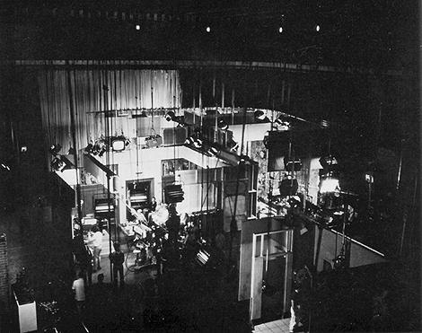 Στούντιο έγχρωμης τηλεόρασης. Τα φώτα και οι οθόνες που κρέμονται από το ταβάνι αφήνουν περισσότερο χώρο ελεύθερο για να κινηθεί το συνεργείο.