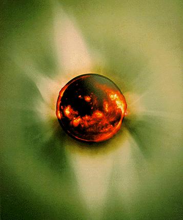 Μία ασυνήθιστη όψη του Ήλιου από σύνθεση εικόνων του στο ορατό φως και στις ακτίνες – Χ. Οι σκούρες περιοχές μπορεί να είναι λαμπρές στο ορατό φως, αλλά ήρεμες και σκοτεινές στα μήκη κύματος των ακτίνων – Χ. Τον Ήλιο περιβάλλει το αραιό αλλά πολύ θερμό στέμμα.
