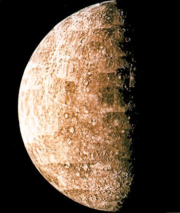 Είναι λίγο μεγαλύτερος σε μέγεθος από τη Σελήνη και η επιφάνειά του είναι διάσπαρτη με κρατήρες.