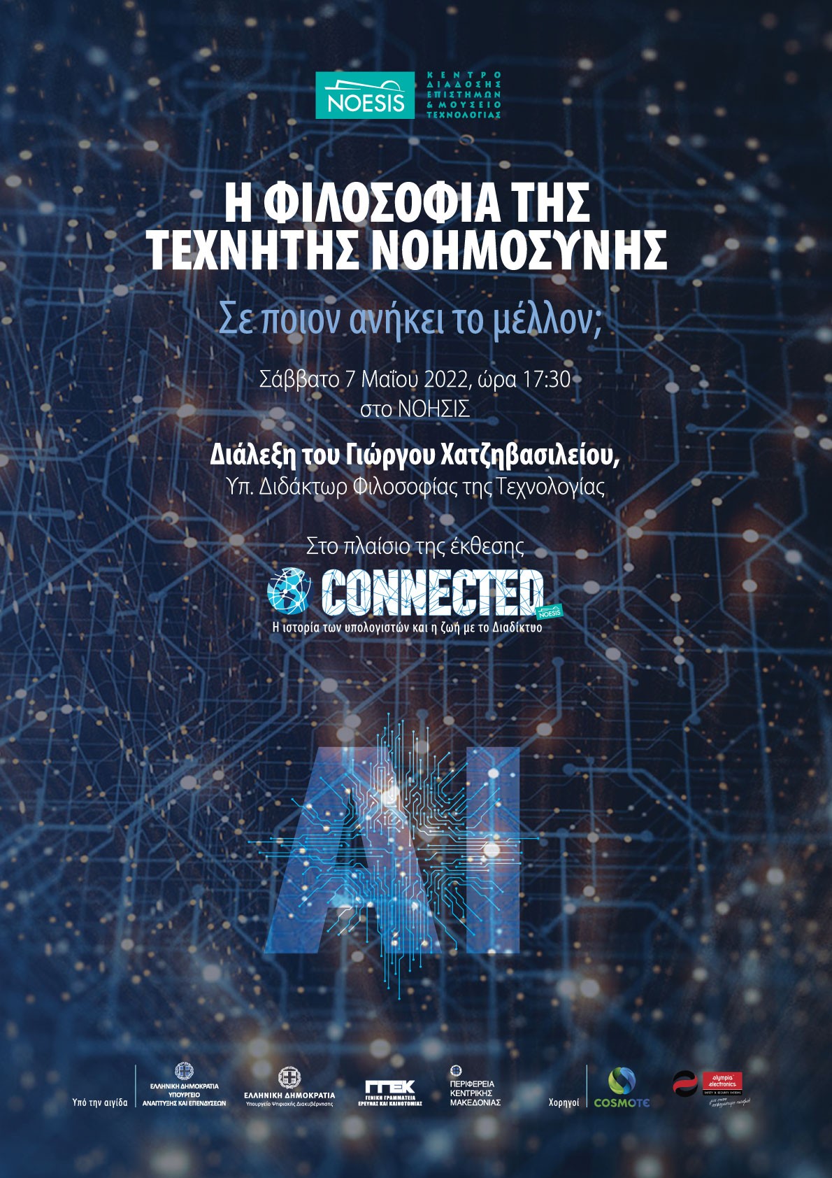 «Μέσα από τα εργαστήρια της τεχνητής νοημοσύνης βγαίνει στις μέρες μας η σπίθα μιας αληθινής κοσμογονίας. Η τεχνητή νοημοσύνη και η ψηφιακή επανάσταση αποτελούν έναν βέβαιο πρωταγωνιστή του 21ου αιώνα. Οι κολοσσιαίες δυνατότητες κι οι απειλές που δημιουργούν θα αλλάξουν βαθιά τον κόσμο μας μέσα στις επόμενες δεκαετίες. Θα φέρουν τον άνθρωπο μπροστά σε κάποιες από τις πιο μεγάλες προκλήσεις που έχει ποτέ αντικρύσει. Τις πλέον κομβικές από αυτές αναζητά και συζητά η διάλεξη που θα γίνει στο ΝΟΗΣΙΣ, στο πλαίσιο της έκθεσης “Connected – Η ιστορία των υπολογιστών και η ζωή με το Διαδίκτυο”.