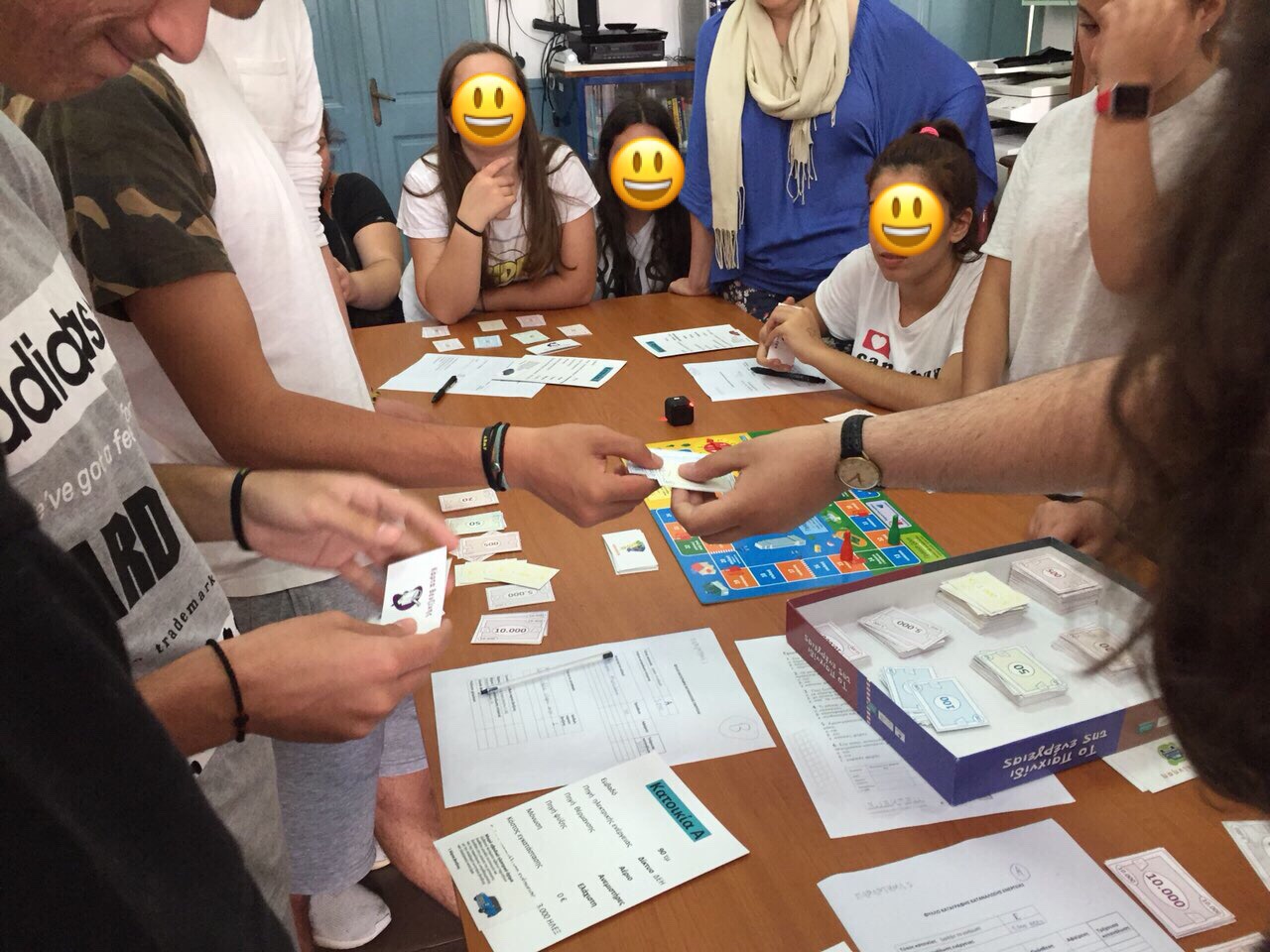 Δευτέρα πρωί και οι μαθητές μετά την πρωινή προσευχή συγκεντρώνονται στις αίθουσες. Ξεκινάμε με το Δημοτικό που αριθμεί 25 μαθητές και 3 δασκάλους, από την πρώτη μέχρι και την έκτη δημοτικού. Χωρίσαμε τους μαθητές σε μεικτές ομάδες ώστε όλες οι ομάδες να αποτελούνται από μαθητές όλων των τάξεων και ο καθένας ανέλαβε από ένα ρόλο. Το παιχνίδι εξελίχθηκε πολύ ομαλά, με ενθουσιασμό από την πλευρά των παιδιών αλλά και τη δική μας! Τα παιδιά αντιλήφθηκαν από πολύ νωρίς τα οφέλη των ανανεώσιμων πηγών ενέργειας κάνοντας τις κατάλληλες επιλογές κατά τη διάρκεια του παιχνιδιού ώστε να μειώσουν τα έξοδα του νοικοκυριού τους! Στο τέλος του παιχνιδιού όλοι έδειξαν να έχουν κατανοήσει το οικονομικό και οικολογικό κόστος που απορρέει από κάθε ενεργειακή επιλογή στην καθημερινότητά τους. Παραδώσαμε το επιτραπέζιο παιχνίδι στους δασκάλους του σχολείου και όλοι, μαθητές και εκπαιδευτικοί, το αποδέχτηκαν με ιδιαίτερη χαρά και έκπληξη.