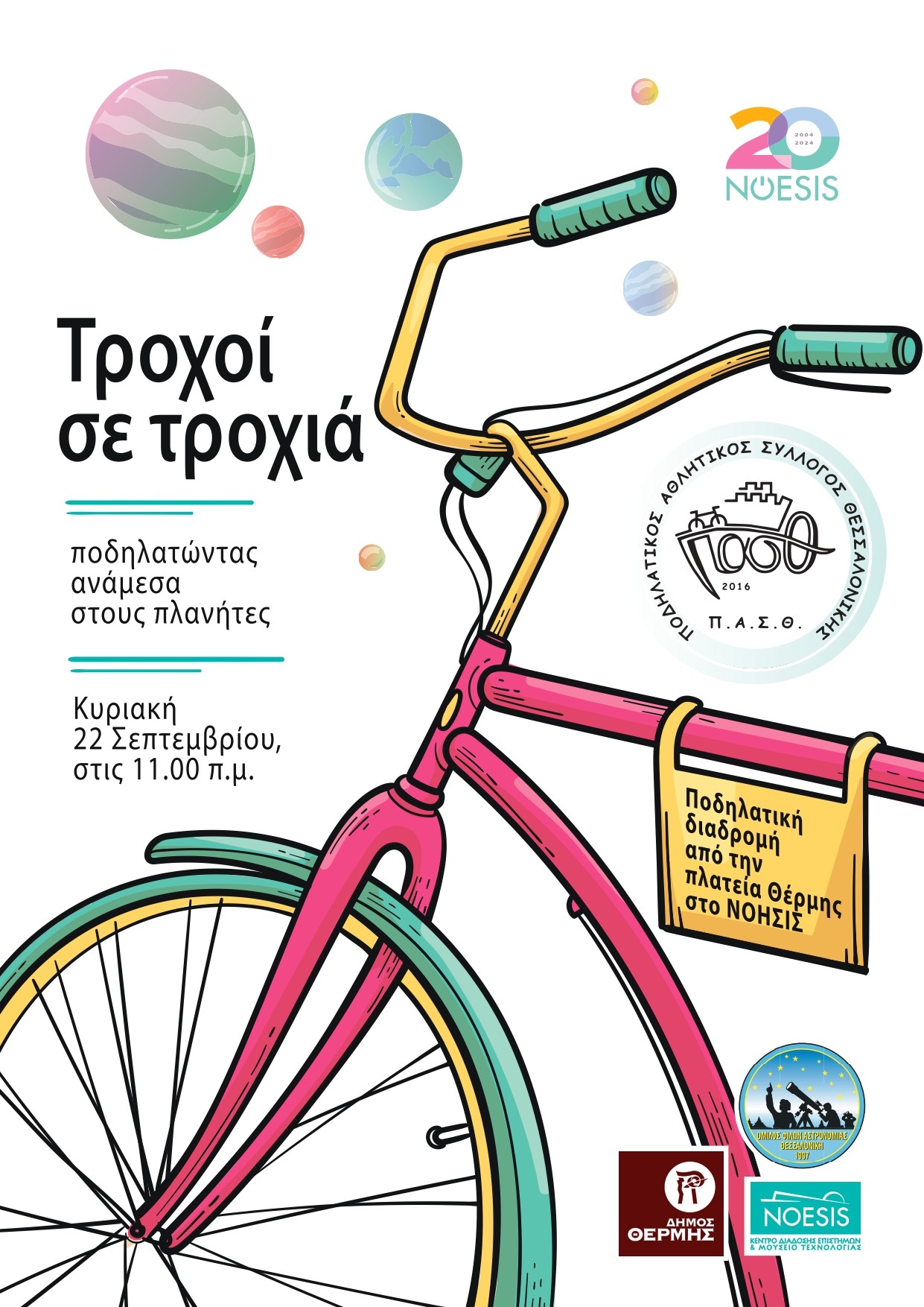 Με σύνθημα «Ποδηλατώντας ανάμεσα στους πλανήτες!» οι ποδηλάτες και οι ποδηλάτισσες, που θα συμμετέχουν στην εκδήλωση, θα διανύσουν τη διαδρομή από την κεντρική πλατεία της Θέρμης έως τη βόρεια είσοδο του ΝΟΗΣΙΣ. Κατά μήκος της διαδρομής θα τοποθετηθούν ως τοπόσημα αντίγραφα (σε κλίμακα), ο Ήλιος και 3 πλανήτες του ηλιακού μας συστήματος: Ερμής, Αφροδίτη και Γη, με την τελευταία να βρίσκεται στην πλατεία Θέρμης και τον Ήλιο στη σφαίρα του πλανηταρίου του ΝΟΗΣΙΣ.